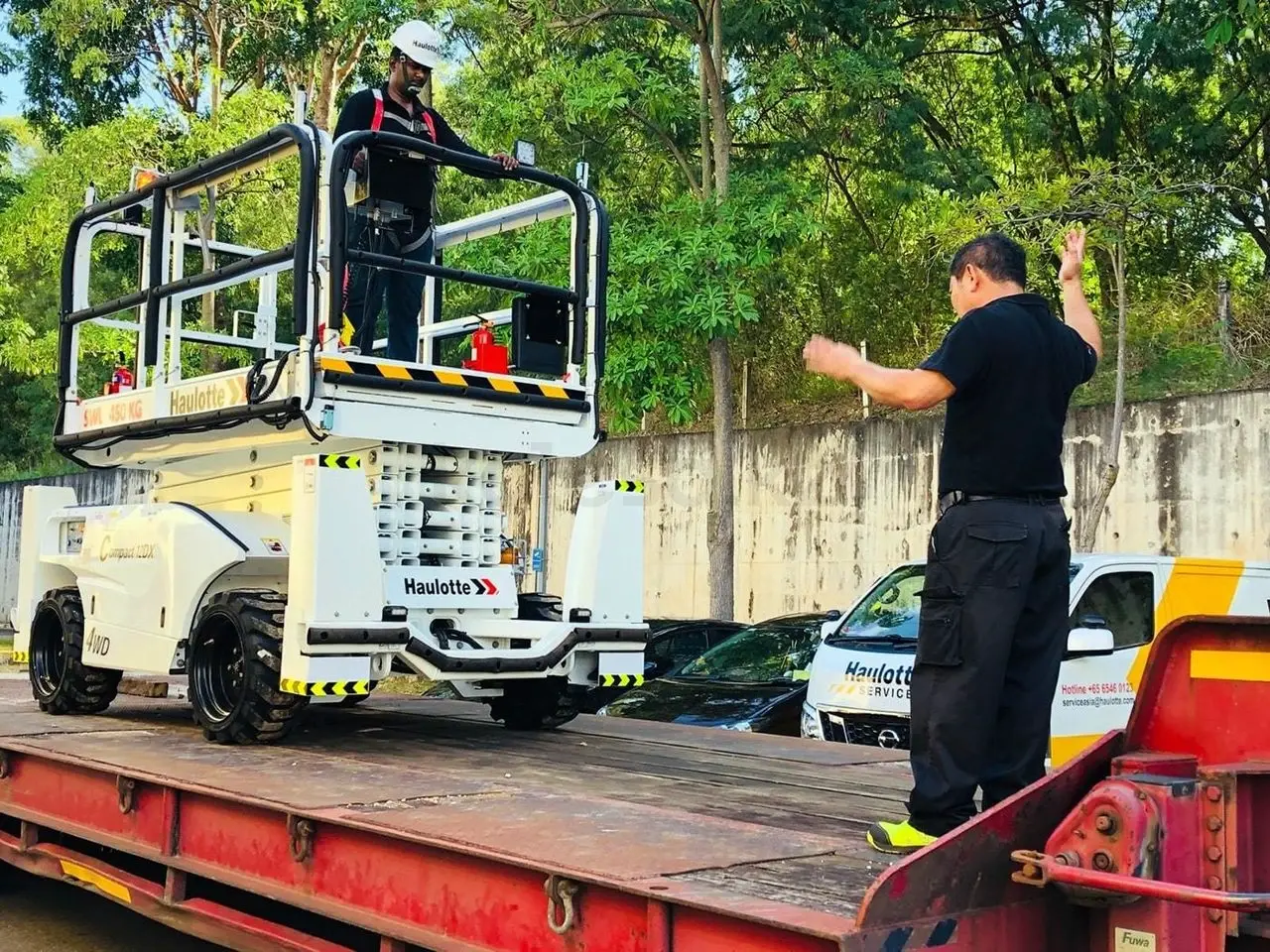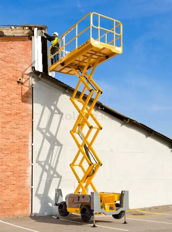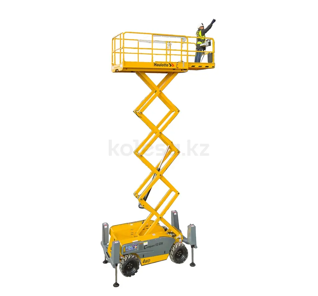 TOO "Aykar Group" предлагает в аренду спецтехнику: Ножничный подъемник Haulotte 12DX из линейки Compact создан, чтобы использоваться в первую очередь на открытой местности. Это обусловлено наличием дизельного двигателя, для которого характерно вырабатывание большого количества выхлопов в процессе подачи энергии. Тем не менее, главным движущим органом модели был выбран двигатель Kubota от японского производителя. Уровень токсичности испарений продуктов сгорания у него ниже, чем у других брендов. Это позволяет эксплуатировать подъемник также в закрытых помещениях, однако при условии хорошего проветривания. В качестве дополнительной опции в комплектацию входят не пачкающие поверхность шины. Технические характеристики: Макс. Рабочая высота, м 12.06 Макс. Грузоподъемность, кг 450 Тип двигателя KUBOTA D1105-W1, 18.5 кВт — 24.8 л. С., Stage 3A Макс. Габариты платформы (с выдвижными секциями), м 3.7 x 1.45 Вес подъемника, кг 4110 Длина подъемника, м 3.17 Ширина подъемника, м 1.78 Макс. Высота платформы, м 10.06 Высота в транспортном положении (с ограждением), м 2.56 Длина платформы, м 2.45 Ширина платформы, м 1.45 Длина выносной секции платформы, м 1.2 Скорость движения, км/ч 0.8 5.5 Максимально допустимый уклон,% 40 Внешний радиус поворота, м 3.5 Колесная база, м 1.84 Дорожный просвет, см 28 Тормоза гидравлические Тип шин 26 x 12 — 16.5 Объем гидравлического бака, л 75 Объем топливного бака, л 30